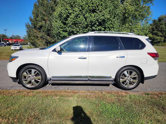 Check out this clean, EXTREMELY well serviced Nissan Pathfinder with 4 wheel drive! Boasting the Platinum package, this ride features alloy wheels with thick Michelin tires, power heated and cooled leather seating, 3rd row seating, dual sunroofs, premium Bose sound system, navigation, backup camera, Bluetooth connectivity, dual screen DVD player, heated steering wheel, steering wheel controls, and much more!
